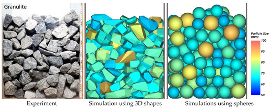 Simulations of the bulk density experiment for granulite particles were conducted using the Rocky DEM simulator, with the parameters in Table 2, the mass distribution as functions of the aspect ratio from Figure 5, and the 3D particles-shape model library illustrated in Figure 8. Figure 9 compares images of the bulk density experiment using a total mass of 80 kg of granulite particles, with the Rocky DEM simulations using the 3D particle shapes model library and also using spheres.