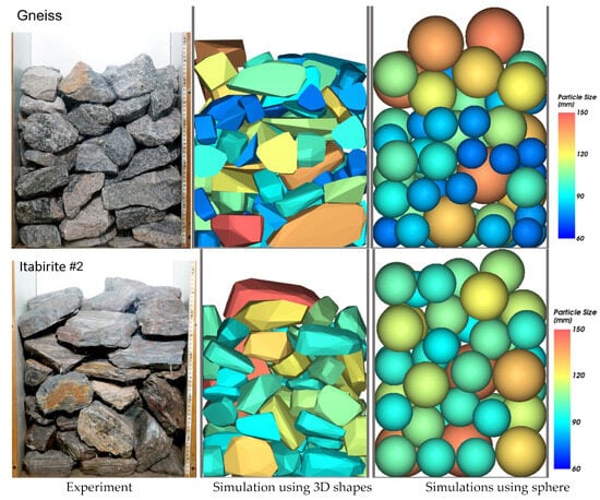 Preliminary validation of the shapes modeled was carried out by comparing bulk density measurements from simulations and experiments for granulite, resulting in very good agreement between the two. Further validation was then carried out by the comparison of experiments for a gneiss rock and another itabirite sample to simulations, with good agreement between both.
