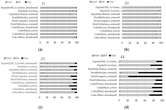 Particle size distribution in the different zones in %: (a) dike zone (Z1); (b) discharge zone (Z2); (c) transition zone or beach (Z3); and (d) distal zone or lagoon (Z4).