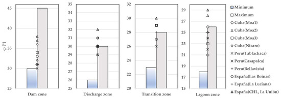 Results of the internal friction angle in the different zones of the tailings’ deposits.