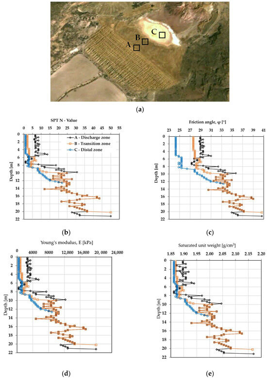 Results of a study with SPT tests in an abandoned TSF: (a) air view; distribution with depth of (b) SPT N-value; (c) friction angle; (d) calculated Young’s modulus; and (e) saturated unit weight. Adapted from internal report [29]. Black boxes refer to the sampling position.