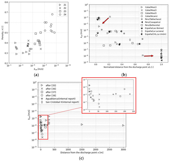 Saturated permeability test results in TSFs as a function of: (a) porosity; (b) normalized distance to the discharge point; and (c) distance to the discharge point (literature review Refs. [35,36,37,38]).