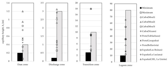 Results of the estimation of the capillary height in the different zones of the TSFs. The bar graph represents maximum and minimum values from Table 2.