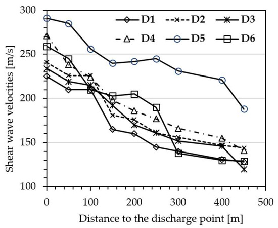 - Decreasing trend: Seven parameters decrease in magnitude from the dam to the settling pond, following the direction of flow of the deposited waste. These parameters are particle size, angle of internal friction, shear strength, dry density, permeability, shear wave velocities, Young’s modulus, and liquefaction resistance.
