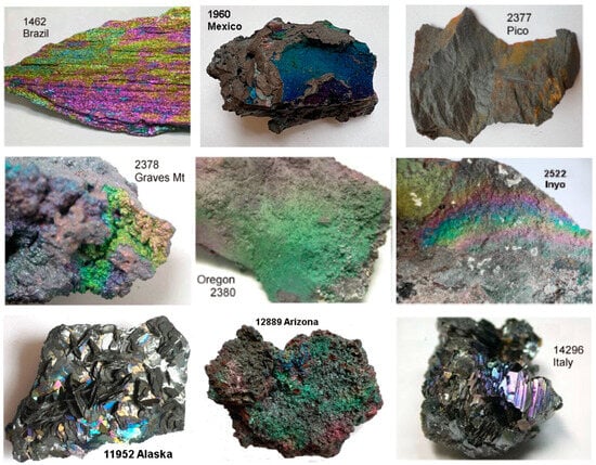 - Heaney, P.J.; Post, J.E.; Chen, S.A.; Clark, T.; Wenzel, T.; Jacucci, G.; Vignolini, S. Painting a Rainbow with Ochre; Iridescence in Botryoidal Goethite. In Proceedings of the GSA Annual Meeting, Indianapolis, IN, USA, 4–7 November 2018. Paper No. 282-12. [Google Scholar]