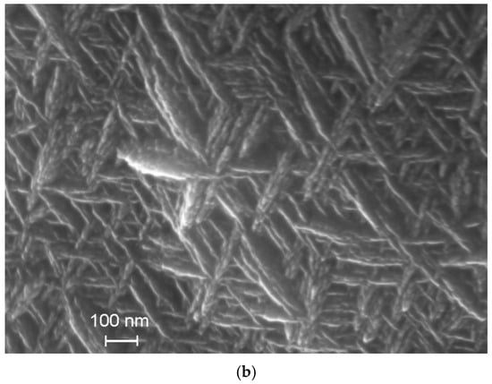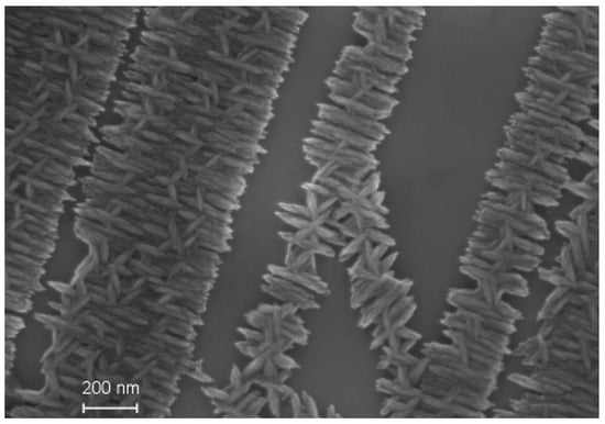 Several attempts to obtain EBSD analyses failed to capture a diffraction pattern, most likely due to the small size of the nanocrystals. We do not have evidence that the coating material is beam sensitive in the SEM. However, from the EBSD analyses, it is possible to determine that when the nanocrystals are arranged on the (0001) surface of hematite, they are arranged in three directions (Figure 4), as revealed by EBSD analysis on sample CIT-11952, where the nanorods (120° apart) are parallel to the [100], [100] and [010] directions (i.e., the directions on the (0001) plane normal to {100} of hematite). Electron diffraction patterns from the coating material were not obtained under TEM. All attempts to obtain ring diffraction patterns failed. The samples were sensitive to rapid damage in the TEM’s electron beam.