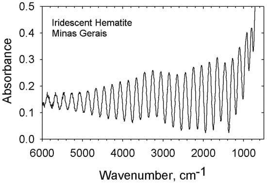 Transmission infrared pattern of a single flake of deep blue, iridescent hematite (1462) that shows apparent broadband in the 3600–2800 cm−1 region admixed with strong interference fringes.