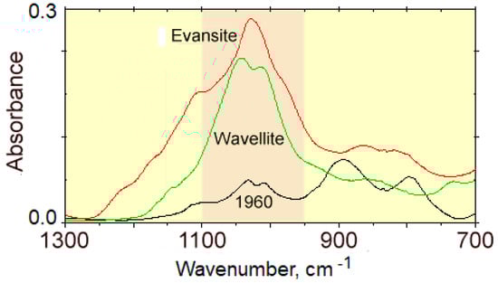 ATR infrared spectra of two phosphate standards, evansite (Al3(PO4)(OH)6·6H2O) and wavellite (Al3(PO4)2(OH)3·5H2O), compared to the phosphate region in iridescent sample 1960.