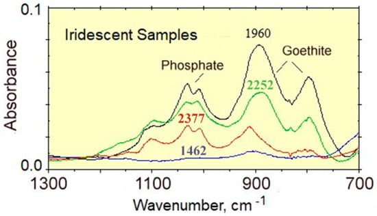 ATR spectra were obtained on all the iridescent samples by either scraping or breaking off a thin portion of the samples with iridescence and grinding them to a powder for placement on the ATR apparatus. Inevitably, some of the underlying material was part of the sampling. All the spectra were dominated by hematite features, with the exception of 12889, which had a large goethite component. Samples 1960, 2378 and 2522 had minor amounts of goethite in the pattern and the sample had 2377 traces of goethite. Samples with thicker amounts of the fibrous material in the SEM tended to show significant absorption in the region where phosphate ions absorb. Figure 8 shows the absorption of two phosphate standards compared to an iridescent sample. Figure 9 shows the spectra of samples with obvious phosphate features in the 1000–1050 cm−1 region. Samples that displayed only thin coatings of the fibrous Al-P material tended to provide little or no indication of phosphate in the infrared spectra. Sample 2380 with arsenate was devoid of absorption in the 1000–1050 cm−1 phosphate region.