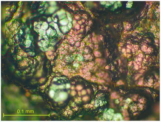Samples with botryodial surfaces (e.g., samples 2378, 12889, 1960) also have the nanocrystals on their surface. In these cases, the crystals are not as well ordered as in the case of the flat crystals, and they may form thicker, six-rayed clusters (Figure 6).