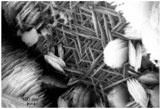 A ZEISS 1550VP field emission scanning electron microscope (FE-SEM) (ZEISS Group, Oberkochen, Germany) with an in-lens detector was used for high-resolution secondary electron (SE) imaging. Low voltage (<5 kV) or 10 kV accelerating voltage imaging was performed on uncoated samples and carbon-coated samples. Low-voltage SE imaging is important for studying the morphology of nanocrystals due to the smaller depth of beam penetration [4]. An Oxford INCA 300 X-ray energy dispersive spectrometer (EDS) (Oxford Instruments, High Wycombe, UK) on the FESEM was used for elemental analysis at 10 kV in spot mode. Quantitative analyses were made with the XPP matrix correction procedure [6]. Electron backscatter diffraction (EBSD) analysis of in-situ crystals at a nanometer scale was attempted using an HKL EBSD system on the FESEM, operated at 20 kV and 0.3 to 1 nA in a focused beam with a 70° tilted stage and at 5 to 10 mm working distance. Electron probe microanalyses were obtained with a JEOL 8200 instrument (JEOL Ltd., Tokyo, Japan) at 15 keV and 30 nA with a 20 μm beam defocus. Standards used were hematite (Fe Ka), anorthite (Al Ka) and apatite (P Ka). The CITZAF matrix correction [7] was employed for quantitative analyses.
