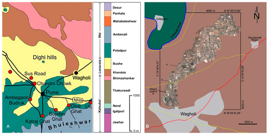 (A) Geological map of the Greater Pune area, including Wagholi [25], showing the geochemical formation boundaries of the different basalt lava flows. (B) Schematic map of the Wagholi quarry complex. Quarrying began in the 1960s in the south-west (Dhoot Quarry a) and continued to the north-east to 2024.