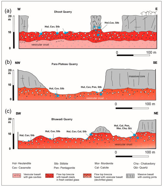 Cross sections across three quarries showing the nature and roughly the associations of the cavansite–pentagonite mineralization. (a) Dhoot Quarry, (b) Para Plateau Quarry, (c) Bhawadi Quarry.