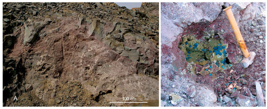 The reddish brecciated areas also consist of basalt and not of andesitic tuff as erroneously depicted in some reports [5,48]. These excavated separate areas do not form always a visible continuous layer of breccia, but are locally limited. There is further an upper continuous vesicular crust (Figure 2) under the excavated zone, which generally overlies the lower lava flow. This vesicular crust has not yet been investigated in detail, so no further statement can be made about the mineralization in this subzone.
