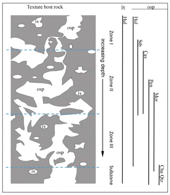 Schematic combined illustration of the different brecciated zones (up to approx. 5 m height) and their mineral assemblage. Isolated vesicles (iv), interconnected open spaces (osp), heulandite (Hul), stilbite (Stb), cavansite (Cav), pentagonite (Pen), mordenite (Mor), chalcedony (Cha), and quartz (Qtz). The illustration shows the different mineralization between the isolated vesicles and the interconnected open spaces and the occurring species with regard to the increasing depth. Not every zone is equally developed in the individual breccias.