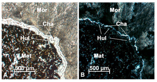 Thin section of sample Mu 05. Photomicrographs of the transition area between the host rock to secondary mineralization. On the surface of the matrix (Mat) is first a thin layer of heulandite (Hul), followed by a layer of chalcedony (Cha) and overgrown by mordenite (Mor). (A) Transmitted light, (B) polarized light. The original shape of the heulandite crystals is still clearly recognizable.