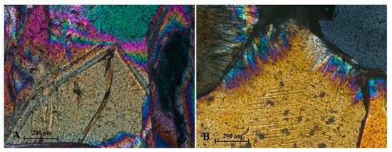 Quartz crystals exhibit typical Bambauer lamellae (Figure 10A). In addition, many quartz crystals show heterogeneous internal structures (irregular extinction in polarized light), which are the result of the recrystallization of former chalcedony. This leads to feathery or flamboyant textures (Figure 10B), which are typical of the hydrothermal origin at low temperatures.