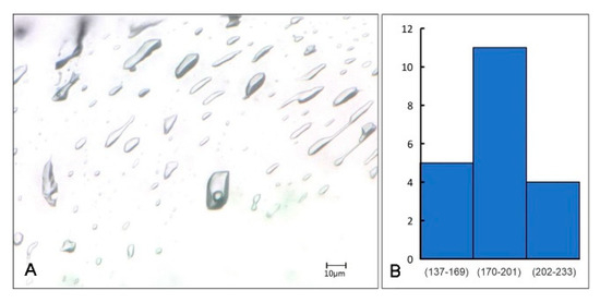 Fluid inclusions of the third calcite generation of sample Mu 01 were investigated. FIuid inclusions in calcite of this generation, that are aligned along intragranular planes of rehealed bended cracks inside the crystals, show locally small channels between the inclusions due to “necking down” [49] and appear mostly as single-phase liquids (up to 95%) without a gas bubble at room temperature (Figure 11A). However, after several cool/heat runs, a considerable number of easily observable bubbles of a constant degree of fill (liquid/vapor proportion) evolved. Their homogenization to the liquid state happened without exception in the temperature range between 137 °C and 233 °C, with a more closed frequency from 170 °C to 201 °C (Figure 11B). Apparent eutectic temperature Te(ice) was used to elaborate the chemical system of the trapped fluids after [46]. Te(ice) below −21.2 °C, the eutectic temperature for the presence of NaCl, and below −10.7 °C, which is defined as the eutectic of KCl in the solution, was not clearly detectable. This is due to the restricted presence of thin ice platelets without any relief compared to additional salt crystals of higher relief, e.g., hydrohalite. The following observation of last ice melting Tm(ice) happened between −0.9 °C and 0.0 °C, which is transferable to all inclusions in calcite. Consequently, the fluid system is reduced to a pure aqueous fluid. Calculated densities correspond to the closed temperature frequency and yield 0.86 g/cm3 to 0.89 g/cm3.