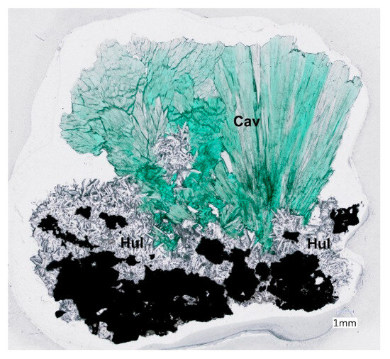 Micrograph of a thick section of sample Mu 10 in transmitted light, which demonstrates that cavansite (Cav) is deposited on heulandite (Hul) and not directly on the host rock.