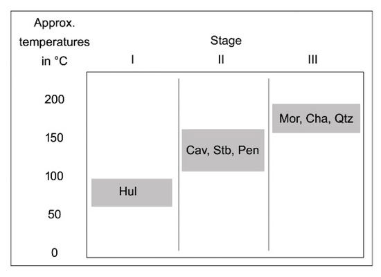 Due to the calcium-rich plagioclase in the common tholeiitic host rock of the MDP the zeolites are the Ca members, especially heulandite-Ca, stilbite-Ca, scolecite, mesolite, thomsonite, chabazite-Ca, and mordenite. The zeolites formed in the tholeiitic basalt of the MDP are considered as classical representatives of the zeolite facies [36]. For these, formation temperatures up to about 200 °C at pressures up to 0.1–0.3 GPa are proposed [37].