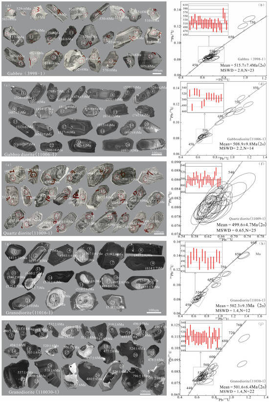 Cathodoluminescence (CL) images, zircon U-Pb concordia diagrams, and age probability density distributions from Kekesha intrusion. (a,b) gabbro (3998-1); (c,d)gabbro diorite (11006-1); (e,f) quartz diorite (11009-1); (g,h) granodiorite (11016-1); and (i,j) granodiorite (11030-1).