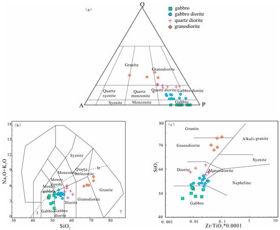 The Kekesha intrusion contains a variety of rock types. Through field geological survey and thin section observation under a microscope, the rock name was first determined by a QAP diagram. In view of the wide variation range of major elements (for example, SiO2 content is 48.92%~74.76%, total alkali (Na2O + K2O) content is 1.86%~9.53%, and Na2O/K2O ratio is 0.49~6.40), the major element analysis data for the Kekesha intrusion are shown in Table S2. The Kekesha intrusion has undergone alteration, and the total alkali (Na2O + K2O) content may change. Therefore, in addition to the QAP diagram (Figure 5a) and the total alkali–silicon diagram (TAS) (Figure 5b), the relatively stable element SiO2-Zr/TiO2*0.0001 diagram (Figure 5c) is supplemented. Most of the samples in the diagram fall within the normal diorite area (with the distribution of gabbro, gabbro diorite, quartz diorite, and granite diorite), which is consistent with the naming of rocks in the field.
