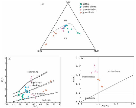 (a) AFM diagram [], (b) rock series classification diagram [], and (c) ANK-ACNK diagram [] of Kekesha intrusion.