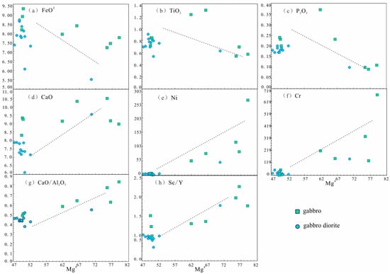 The Harker diagrams for the major and trace elements in gabbro and gabbro diorite from the Kekesha intrusion reveal negative correlations between FeOT, TiO2, and P2O5 with Mg# (Figure 7a–c), while CaO, Ni, Cr, CaO/Al2O3, and Sc/Y exhibit positive correlations with Mg# (Figure 7d–h). The Harker diagrams for the major elements in quartz diorite and granodiorite show significant negative correlations between Al2O3, P2O5, Fe2O3T, TiO2, CaO, and MgO with SiO2 (Figure 8a–f).