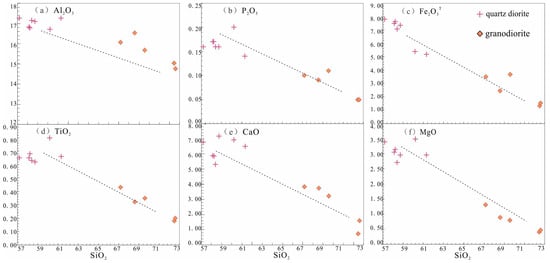 Harker diagram of major elements in quartz diorite and granodiorite in Kekesha intrusion.