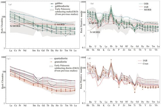(a,c) Chondrite-normalized REE patterns and (b,d) primitive mantle-normalized trace element spider diagrams of Kekesha intrusion. (The chondrite and primitive mantle values are from Sun and McDonough [], respectively.) Crustal values according to Rudnick and Gao []; the values of Early Paleozoic mafic rocks in East Kunlun: Feng et al. [], Li et al. [], Liu et al. [], Meng et al. [], Wei Bo [], Sang et al. [], and Li et al. []; and the values of Early Paleozoic diorite in East Kunlun: Zhang et al. [] and Wang et al. []).