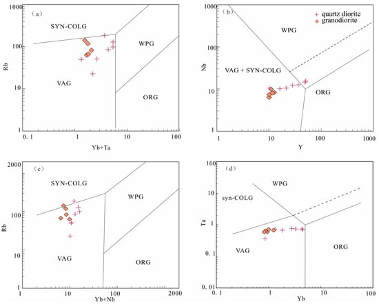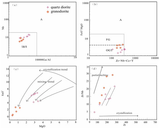 Discrimination diagram of genetic types of quartz diorite and granodiorite in Kekesha intrusion ((a,b) according to Whalen et al. []; (c) according to Martin []; (d) according to Zorpi et al. []; A, A-type granite; I, I-type granite; S, S-type granite; FG, fractionated felsic granites; and OGT, unfractionated M-, I-, and S-type granites).