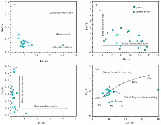 The gabbro and gabbro diorite samples from the Kekesha intrusion exhibit characteristics consistent with calc-alkaline basalt, including low TiO2, high Al2O3, and relative enrichment in large-ion lithophile elements (LILEs) and light rare earth elements (LREEs). These rocks are characterized by a depletion in heavy rare earth elements (HREEs) and high-field-strength elements (HFSEs) (Figure 9a,b), which closely resembles melts derived from the partial melting of an enriched lithospheric mantle [,,,], showing typical island-arc basalt (IAB)characteristics. In addition, in the La/Yb-Nb/La diagram, most of the gabbro and gabbro diorite samples in the Kekesha intrusion fall into the lithospheric mantle source region, but a few fall into the mixed mantle source region, and gather around the boundary between the lithospheric mantle and the mixed mantle (Figure 11a), indicating that they originate from the partial melting of the enriched mantle source region and are partially affected by the asthenosphere mantle material [,]. The research results have shown that there are significant differences in the activity of trace elements in plate subduction, in which the fluid in the subduction material and the magma caused by melt metasomatism will show different trace element content characteristics []. The Th/Yb, Ba/La, Th/Nb, and U/Th ratios indicate a relatively stable Th/Yb ratio and a broad Ba/La ratio (Figure 11b), as well as a broad Th/Nb and a narrow U/Th ratio (Figure 11c), providing evidence for fluid-induced metasomatism during subduction [,] (Figure 11c).