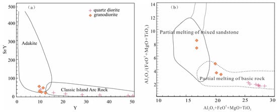 Diagrams of quartz diorite and granodiorite from Kekesha intrusion: (a) Y-Sr/Y diagram [] and (b) (Al2O3 + FeOT + MgO + TiO2)-Al2O3-/(FeOT + MgO + TiO2) diagram [].