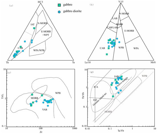 The gabbro exhibits a high SiO2 content, ranging from 48.92 wt.% to 51.94 wt.%. The TiO2 content varies from 0.54 wt.% to 1.29 wt.%, which is comparable to that of island-arc basaltic volcanic rocks (0.58 wt.% to 0.85 wt.%) []. The content of Al2O3 changes greatly, ranging from 10.90 wt.% to 19.75 wt.%, which is characteristic of high-aluminum basalts typically found in subduction zones []. The Na2O content ranges from 1.13 wt.% to 3.53 wt.%, while the K2O content varies between 0.48 wt.% and 1.67 wt.%, with total alkali content (Na2O + K2O) fluctuating between 1.61 wt.% and 5.2 wt.%, although Na2O generally exceeds K2O. The P2O5 content ranges from 0.09 wt.% to 0.37 wt.%. The MgO content spans from 3.82 wt.% to 13.99 wt.% and the Mg# (molar Mg/(Mg + Fe)) ranges from 48.92 to 79.17. In the total alkali–silica (TAS) diagram (Figure 5b), the gabbro plots within the sub-alkaline field. In the (Na2O + K2O)-FeOT-MgO (AFM) diagram (Figure 6a), it falls into the calc-alkaline series, indicating that the gabbro belongs to the calc-alkaline basalt group. Therefore, the gabbro is classified as part of the calc-alkaline series.