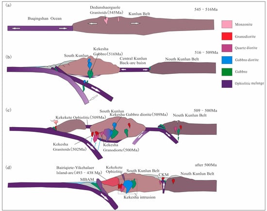 In summary, the Kekesha intrusion completely covers all rock types of basic rock, intermediate rock, and acidic rock. With the evolution of rock to acidity, each lithology has a roughly gradual relationship in terms of mineral composition and main trace element content. The content level of Mg# gradually decreases, and the intrusion differentiation index (DI) (gabbro 13.79~35.56; gabbro diorite 32.48~47.06; quartz diorite 43.17~52.14; and granodiorite 70.73~90.81) increases gradually. The chondrite-normalized rare earth element distribution diagram and the primitive mantle-normalized trace element spider diagram show roughly the same positive and negative anomaly trends (Figure 9), and the Harker diagram has a good linear relationship (Figure 7 and Figure 8), indicating that these four types of rocks come from the same or an interrelated magma source region. Combined with the zircon U-Pb age determination results for the Kekesha intrusion in this paper, they are gabbro (515.7 ± 7.4 Ma, 3998-1), gabbro diorite (508.9 ± 9.8 Ma, 11006-1), quartz diorite (499.6 ± 4.0 Ma, 11009-1), and granodiorite (502.3 ± 9.3 Ma, 11009-1 and 501.6 ± 6.4 Ma, 11030-1), which shows that the age of the rock formation becomes gradually younger during the evolution from basic to acidic. This paper proposes that the formation of the Kekesha intrusion occurred during the subduction of the oceanic crust. The heat generated by the subducting slab, along with the fluids released during slab dehydration (which are rich in H2O and large-ion lithophile elements such as K, Rb, Sr, U, Th, and rare earth elements), induced partial melting of the lithospheric mantle material. At depths of 75–80 km, a small amount of asthenospheric mantle material mixed with the lithospheric mantle, resulting in the formation of basic magma (515.7–508.9 Ma). Due to the difference in relative density, the basic magma migrates upward and resides at the bottom of the thick and light continental crust. These hot basic magmas provide heat for the partial melting of basic rocks in the lower crust and form new magmas, which are then mixed with basic magmas, and assimilated and homogenized (MASH) to form basic or intermediate diorite magmas (508.9–499.6 Ma). During the continuous subduction, basic or intermediate mixed magmas are continuously generated and accumulate at the bottom of the lower crust, and the temperature and pressure of the magma gradually increase, which leads to the crystal fractionation of the magma. The basic minerals such as pyroxene, hornblende (most of which forms hornblende crystals due to rich water-bearing fluids), and plagioclase first begin to crystallize and form crystal mush. The pressure between crystals leads to the retention of more basic crystals, while more intermediate melts migrate upward and stay in the middle crust due to pressure and density differences [] and continue to crystal fractionation to generate intermediate-acid magma. With the decrease in temperature and pressure, the crystal fractionation continues, and the residual melt forms anhedral minerals (such as quartz and potassium feldspar) between the crystals. Finally, it is mixed with a small amount of crustal material to form an intermediate or acidic granitic magma (502.3–499.6 Ma). These different melting source regions and degrees of crystal fractionation led to intrusions in different lithologies, forming a complete set of cross-stratigraphic island-arc magmatic systems with a time transition relationship (Figure 13) [,,].