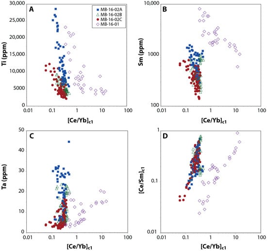 Fersmite has elevated REE concentrations with SREE ranging from 3190 to 20,830 ppm for three samples with all REE analysed and not including Y. The REE patterns for the spot data on three samples are plotted in Figure 5, all of which show double-humped MREE enrichment. The MREE hump does appear to be shifted to heavier REE compared to fersmite in other deposits in BC [34]. Sample MB-16-01 differs from the other three samples in that the MREE enrichment occurs at lighter REE, such that Sm concentrations in sample MB-16-01 are higher than samples MB-16-02A, B, or C (Figure 4). Sample MB-16-01 is also more HREE depleted with [Ce/Yb]c1 normalised values much higher than the other samples (Figure 4). All samples have low La compared to Ce (i.e., negative La anomalies; Figure 5).
