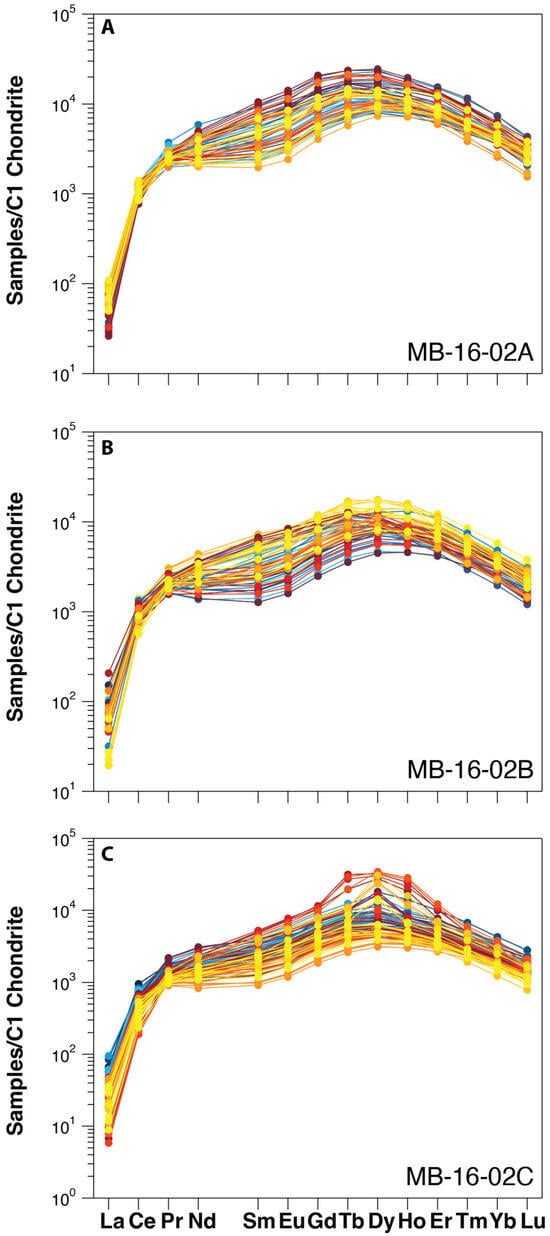 Figure 5. Chondrite-normalised REE plots for MB-16-02A (A), B (B), and C (C), showing MREE enrichment and large depletion in La. MB-16-01 is not plotted, as not all REEs were analysed for that session. Chondrite normalising values from [33].