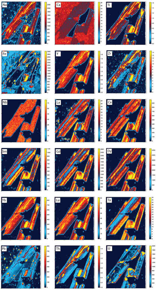 Compositional maps of fersmite crystals (Figure 6, Figure 7 and Figure 8) show well-developed zonation in terms of Na, Ti, Fe, Y, the REE, Ta, Pb isotopes (e.g., 208Pb), Th, and U. This systematic zonation explains the relatively high degree of variability in the spot data (Supplementary Table S3) and indirectly confirms the internal consistency of the trace element data (Supplementary Tables S2 and S3).