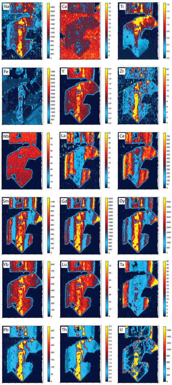 Figure 8. Laser ablation maps of fersmite grain from sample MB-16-02C. All analytes are in ppm except Ca, Mg, Ti, Y, and Th, which are in wt.%. The area of each image is 820 µm × 600 µm.