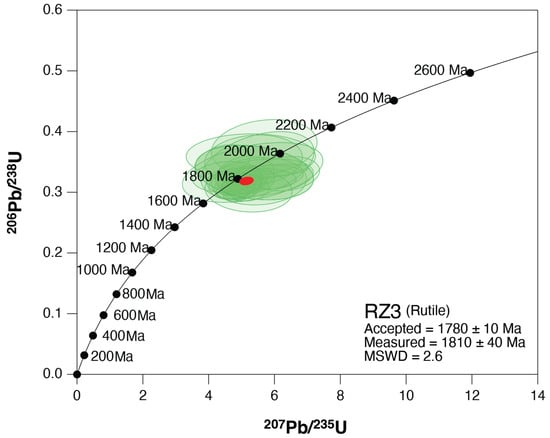 Typically, LA-ICP-MS U-Pb geochronology employs matrix-matched reference materials to obtain accurate results. There are no such materials for fersmite, so we instead employed the approach that McFarlane [11] applied to allanite dating, more specifically, using NIST610 (a synthetic and well-characterised glass) for calibration with a specialised data-reduction scheme. To demonstrate that this approach is capable of reproducing the known age of an oxide, we analysed RZ3 rutile [23]. For the conditions used in this study, the ablation of rutile and NIST610 were sufficiently different such that the downhole fractionation model determined for U-Pb from NIST610 did not adequately compensate for this effect in rutile. However, if we limit the data to the first half of each spot (i.e., when the hole is shallow), the age of RZ3 is reproduced within uncertainty (Figure 10) i.e., we derived an age of 1810 ± 40 Ma compared to the accepted value of 1780 ± 10 Ma [23].
