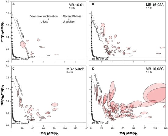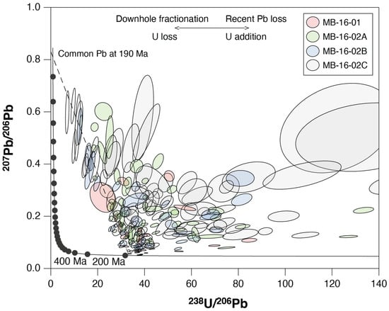 Tera–Wasserburg concordia diagrams for each of the samples are shown in Figure 11 and are combined in Figure 12. Recalling that concordant data at ca. 190 Ma would be pulled up towards a y-intercept of 0.834 (common Pb composition from terrestrial Pb evolution model at 190 Ma), and Pb loss tends to pull data to higher 238U/206Pb (to the right), it appears that all the data fit well with a ca. 190 Ma event. However, due to the high degree of scatter and the unknown amount of uncompensated downhole fractionation, a more robust/reliable age cannot be determined from these data alone. Additionally, because excess downhole fractionation is more likely to pull data towards lower 238U/206Pb values, the estimate of 190 Ma may be slightly high.