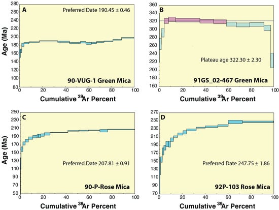 The fine-grained green mica 91GS/02-467 yielded an integrated date of 314 Ma. Although Isoplot generated a plateau date for this sample (322 Ma), it is possible that the mica also experienced recoil loss of 39Ar. The last step (1200 °C) yields a date of 224 Ma that approaches the dates of the other mica samples.