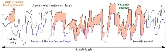 The insoluble material length ratio quantifies the accumulation of residual or undissolved material along the stylolite surface. This parameter is calculated by measuring the sum of lengths of stylolite sections that are filled with insoluble material divided by the total stylolite length (filled or not with insolubles). The parameter is calculated as the average of the result of the two stylolite interfaces, i.e., upper and lower), following its trace (Figure 2). The final value is expressed as a percentage of the stylolite length filled with residue. It is important to note that part of the insoluble material can be unintentionally removed during thin section preparation, and thus, the results should be considered as a minimum value. The value ranges from one, meaning a stylolite that continuously contains insoluble material along its full length, to zero for a stylolite that does not contain insoluble material (i.e., is an open space).