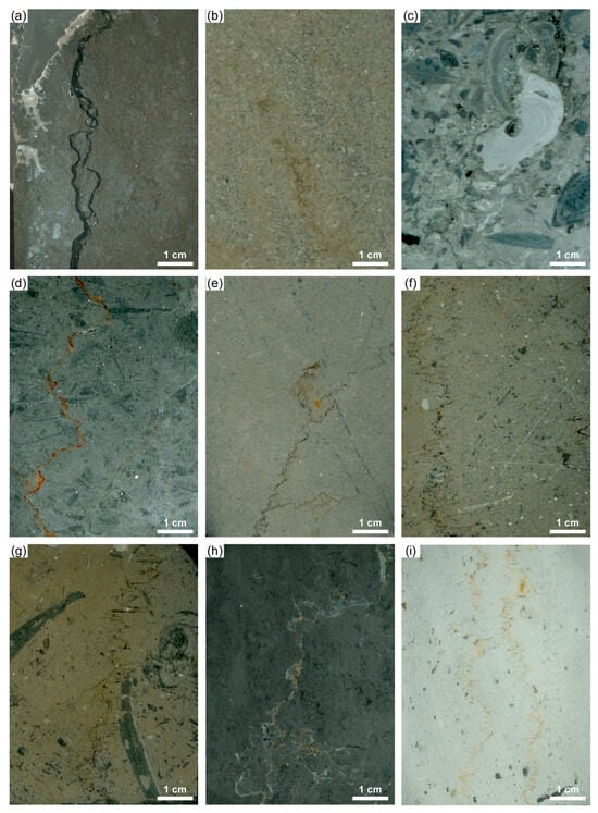 The most important characteristics of the host rock textures in investigated samples are described according to Dunham’s classification [62] (Figure 3). In terms of the carbonate rock texture, wackestones are the most abundant among the studied samples (30%), while mudstones (22%), packstones (24%) and grainstones (24%) are nearly equally represented (Table 1). Several thin sections show local texture transitions (i.e., from mudstone to wackestones, or wackestone to packstone) making it sometimes hard to associate each sample, and hence its stylolites, with a single rock texture.