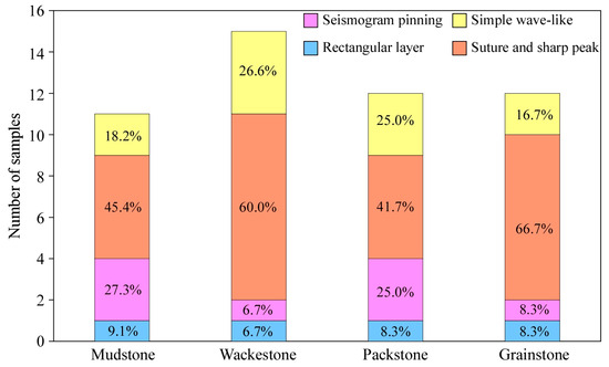 Investigated stylolites (Figure 4) are described according to the scheme of Koehn et al. [29], and their abundance is quantified in relation to the corresponding carbonate host rock texture (Figure 5). The four stylolite types are represented in the dataset as follows: rectangular layer type (8%), seismogram pinning type (18%), suture and sharp peak type (52%) and simple wave-like type (22%). The rectangular layer type is scarce, although it has been identified in all the rock textures.