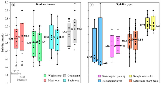 The results indicate a slight increase in stylolite linearity from those hosted in mud-supported textures towards cases of grain-supported textures, suggesting that rock texture partially controls stylolite contortion (Figure 6a). However, there is a weak correlation between Dunham rock texture and stylolite morphology, as revealed by the very large range of linearity values for all the rock textures (Figure 6a). This can be potentially related to the variable presence of pinning particles, variable grain size and grain size distribution, and amount of micrite and clay content. Sometimes, the presence of larger grains embedded in a matrix, such as bioclasts in a wackestone, results in higher contortion. Other studies have reported similar stylolite types for different rock textures [30].