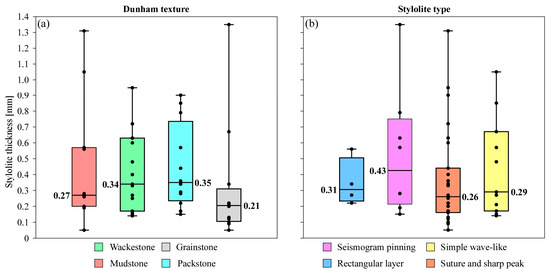 Stylolite thickness for Dunham rock textures (a) and stylolite types (b). Each coloured box marks the 25 and 75 percent quartiles for each dataset, which correspond to each rock texture or stylolite type. The median of each dataset is indicated with a horizontal line in the box, and the corresponding median value is also provided. The black vertical lines show the minimal and maximal values of each dataset, while each black dot represents an individual measurement.