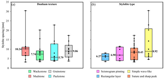 Plots showing the maximum stylolite spacing, measured perpendicular to each stylolite set, for Dunham rock texture (a) and stylolite type (b). Each coloured box marks the 25 and 75 percent quartiles for each dataset, which correspond to each rock texture or stylolite type. The median of each dataset is indicated with a horizontal line in the box, and the corresponding median value is also provided. The black vertical lines show the minimal and maximal values of each dataset, while each black dot represents an individual measurement.