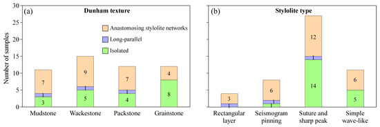 The analysis of stylolite connectivity is influenced by the small area of observation corresponding to a thin section. However, this analysis can still provide useful observations. The results show that the long parallel stylolite distribution type is very scarce for all the samples analyzed, regardless of stylolite type and limestone texture (Figure 10). Regarding rock textures, stylolite networks are more abundant in wackestones, being the same in packstones and mudstones, while they are quite scarce in grainstones (Figure 10a). By contrast, isolated stylolites (i.e., not connected) are well represented in mudstones, wackestones and packstones and are abundant in the case of grainstone textures. Stylolites appear mostly isolated in grainstones, followed by mudstones and wackestones (Figure 10). Stylolite networks are more abundant in wackestones and packstones, especially those of the suture and sharp peak type, and in mudstones with seismogram pinning and suture and sharp peak types.