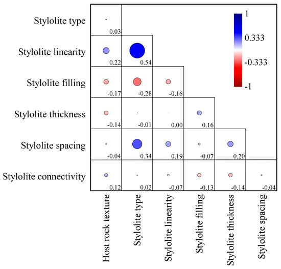 Correlation matrix showing the linear r (Pearson) correlation coefficient between stylolite and host rock measured parameters. The Pearson correlation coefficients range between −1 and +1, indicating negative and positive correlations, respectively, while a value of zero means no correlation. The value of the Pearson correlation coefficient is shown in the corresponding cell. The circle size ranges between 0 (no correlation) and −1 or +1 (maximum negative or positive correlation).